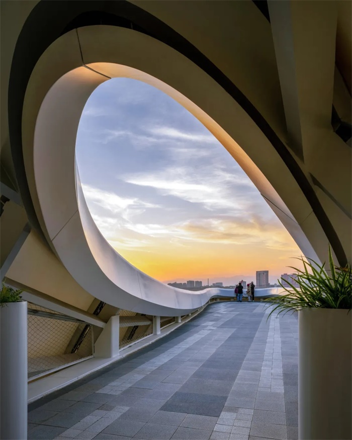 建筑采用整体轻盈的异形曲面屋PTFE膜结构屋顶,犹如漂浮于地面的云朵。入口处采两层通高的玻璃幕墙,将自然景观引入室内,并提供良好的自然光线。实体墙面部分采用金属幕墙竖向分割构造出丰富的细节。