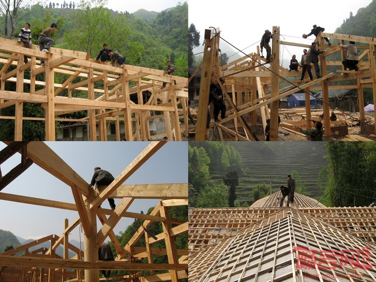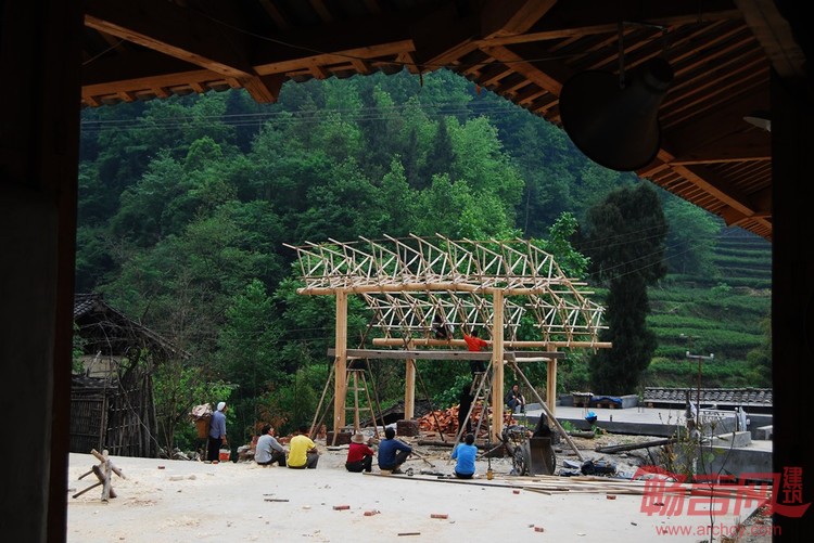 打基础的那天,人们冒雨劳动,即便没有学龄孩子的家庭也来参加。依然崇尚互助的他们,被传统价值观的纽带紧密连接在一起。在屋架起山、操场打地坪的大工作量劳动时,村民们都呼唤而来,以一种自然的分工有序地完成。有限的资金也得到了充分地利用。因为山里的木材易腐易蛀,使用市场上的俄罗斯樟子松,尽管木材商让利几近赔本,仍然超出预算很多,幸亏捐资人的持续募捐化险为夷。实习生刘艳旭和黄龄萱相继驻工地并参加劳动。木屋架是当地传统穿斗式结构的发展,我们一开始设计的与民乐村相同的钢夹板也被木匠建议修改为榫卯加木栓的传统做法。原木裁切方木产生的板条用来做木望板和挂瓦条。十字交叉部位的树状结构的中柱是设计的重点,我们也无法用图纸完全想清楚连接方式和构件尺寸,木匠发挥了他们的智慧,现场比量设计结构。看到中柱立起来的时候,不仅是很多人的努力和辛劳,建筑是一个人类创造的事件,是一个长长的过程,是一个又一个的人,他们的精神与行为,一次又一次地转化成的物质,这是他们的纪念物。2010年9月,茶园小学主体建成并投入使用,只有九个学生,一个老师。因为学校建造质量和设施完善,当地教委决定从2011年9月新学期按照学区统一分配生源和教师。看到孩子们在操场上嬉戏,看到他们灿烂的笑容,我们感到一切的付出都是值得的。