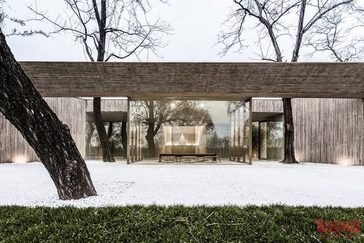与自然的关系进一步延伸至材料层面。建筑墙面与屋顶采用混凝土整体浇筑,一次成型。混凝土模板由3公分宽的松木条拼合而成,自然的木纹与竖向的线性肌理被刻印在室内界面,让冰冷的混凝土材料产生柔和、温暖的感受。固定家具也是由木条板定制的,灰色的木质纹理与混凝土墙产生一些微差。室内地面采用光滑的水磨石材,表面有细细的石子纹路,将外界的自然景色映射进室内。室外地面则由白色鹅卵石浆砌而成,内与外产生触感的变化。所有门窗均为实木门窗,以体现自然的材料质感。禅宗讲究顺应自然,并成为自然的一部分。这同样也是这个空间设计的追求——利用空间、结构、材料激发身体的感知,人与建筑都能在一个平常的乡村风景之中重新发现自然的魅力,与自然共生。