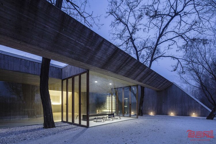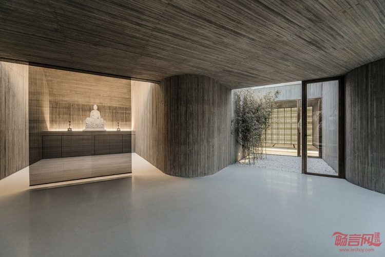 佛龛背墙面水,天光与树影通过佛龛顶部的天窗沿着弧形墙面柔和的洒入室内,渲染佛祖的光辉;茶室向遍植荷花的水面完全开敞,几棵树分居左右成为庭院的一部分,创造品茶与观景的乐趣;休息室与建筑其他部分由一个竹庭院分隔,让起居活动伴随着一天时光的变化。建筑物整体覆土成为土地的延伸,成为树荫之下一座可以被使用的“山丘”。