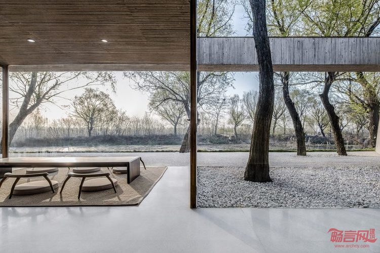 为了将河畔树木完好的保留下来,建筑平面小心翼翼的避开所有的树干位置,它的形状也像分叉的树枝一样伸展在原有树林之下。依靠南北与沿河面的两条轴线,建筑内部产生出五个分隔而又连续一体的空间。五个“分叉”代表了出入、参佛、饮茶、起居、卫浴五种不同的空间,共同构成漫步式的行为体验。建筑始终与树和自然景观保持着亲密关系。出入口正对着两棵树,人从树下经由一条狭窄的通道缓缓的走入建筑之内。