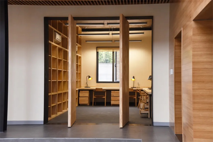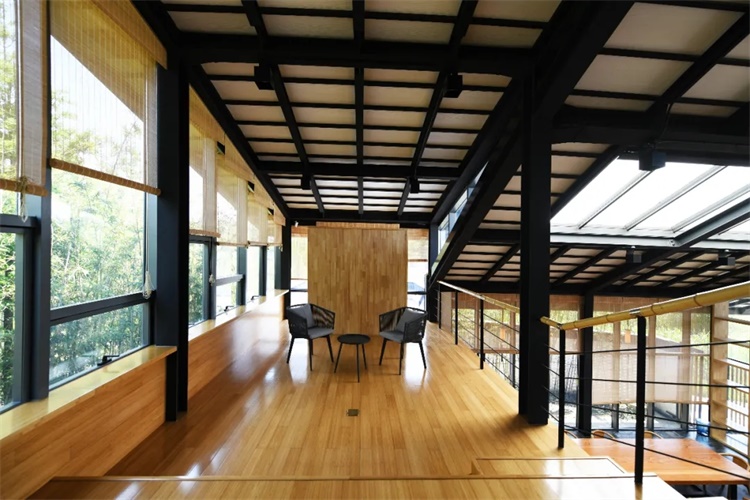 建筑的室内,完全是全新植入的设计方法,二楼的老走廊变成了工作台,新建的厨房上面是开沙龙的小剧场,而沙龙台阶的下面,是空调的出风口,竹匠们在竹地板上一个一个手工开凿了空调的出风口。