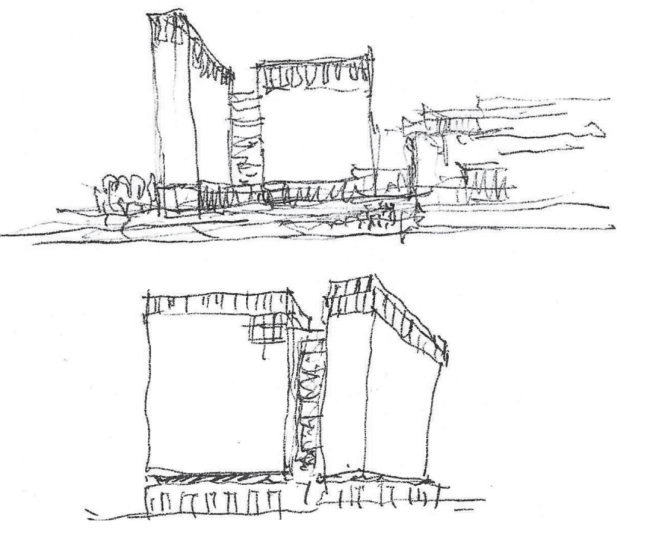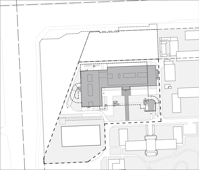 为此,我们从单栋建筑设计扩展到整个校园,对其进行了设计研究,建议将来具备条件时,可将校门南侧的现状会堂拆除再建设一栋高楼,以使校园空间格局更为完整。