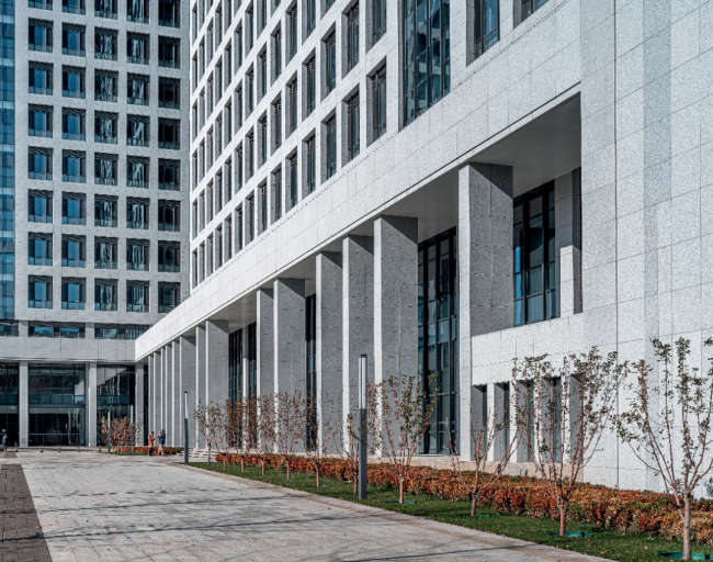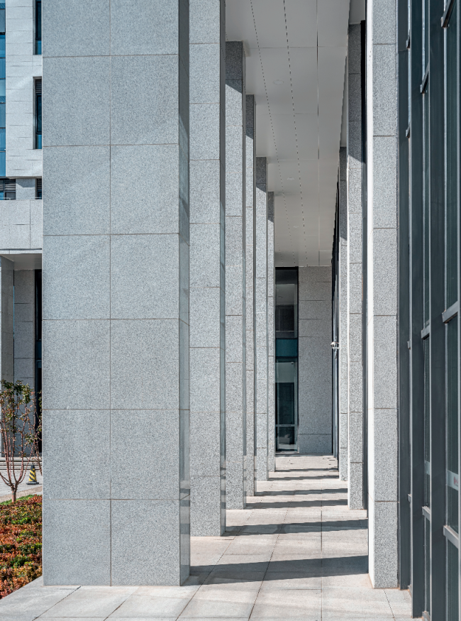 建筑立面以统一的窗格形成网状的立面格局,分隔窗的梁柱取均匀的尺寸,以营造一种有力度的形象。窗的设计以水平三分,形成细微的光影,表达力度下的精确感。建筑以灰白色石材饰面,裙房和院落中地下室出口局部采用红色锈钢板等,与周边既有的1950年代红砖建筑相呼应。