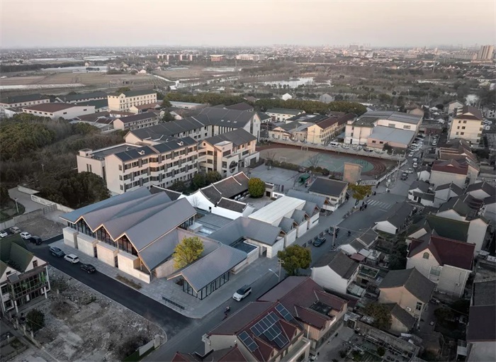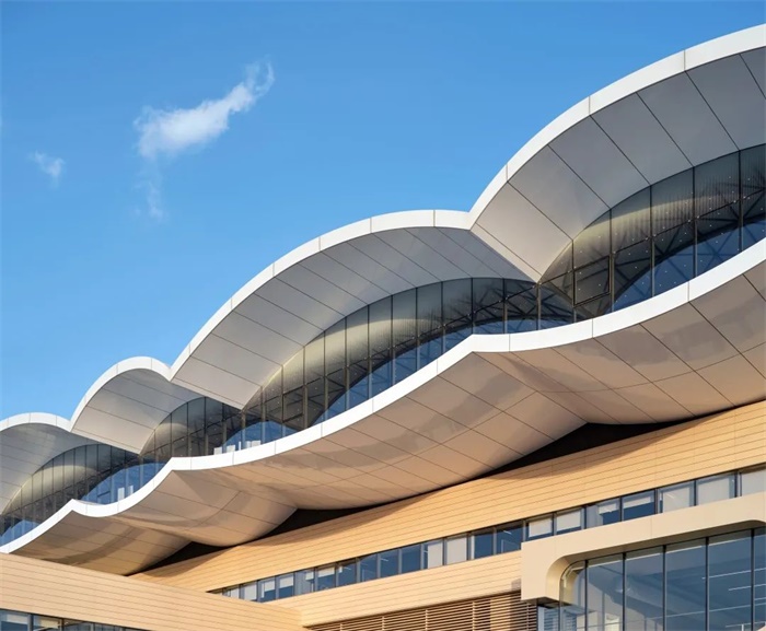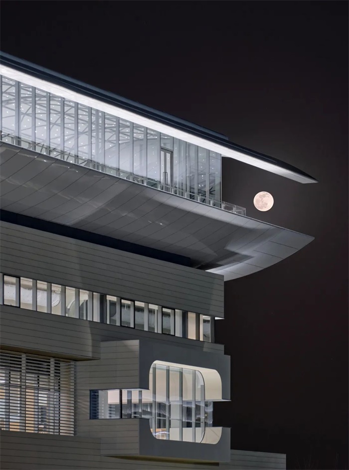 建筑设计顶层出挑,通过形体自遮阳防止下部楼层太阳直射,立面横向长窗降低窗墙比,提升保温隔热性能,回应当地气候特征。