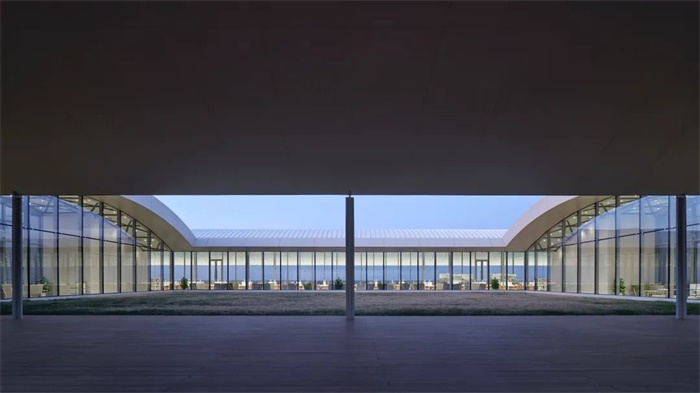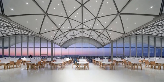 中国民航大学图书馆对“阅览一藏书”的二元功能体系进行重新解构。建筑主体分为结构核心、带状舱体、云上阅览三大体系,结构核心布置密集书库及竖向交通,并提供有力的结构支撑,带状舱体层层搭接,容纳通用阅览及办公空间,云上阅览厅置于顶层,营造平层无柱大空间。