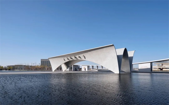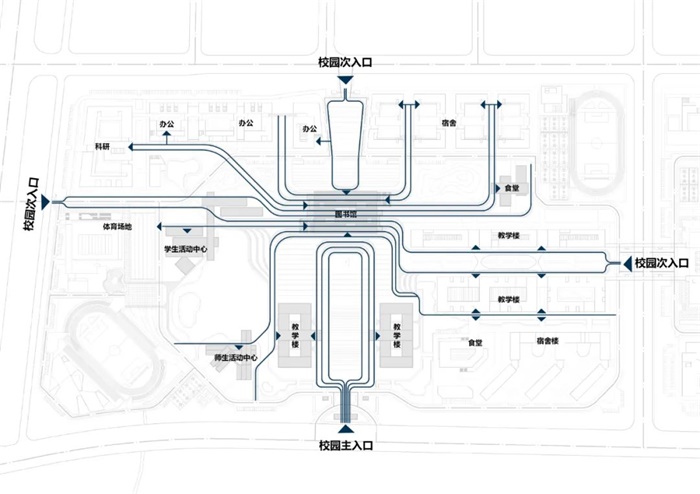面对新校区既有规划的强烈轴线感与仪式感,中国民航大学图书馆的设计并没有在高度或体量上凸显大学图书馆的独立性与重要性,而是将图书馆作为规划优化提升与系统梳理的空间节点加以塑造,在规划设计层面将纵向礼仪轴进行柔化,同时将横向功能带进一步丰富,形成多向联通的教学生活脉络。