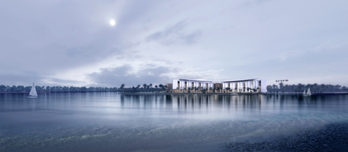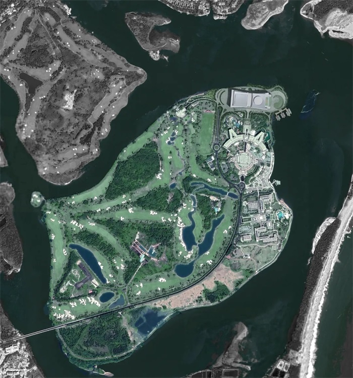 项目选址在东屿岛东北鳌头位置,契合“独占鳌头”的暗喻。新建会议会展最大限度利用岛内现状道路和地势形态,延续一期的南北向延长线,反弧形的设计与一期形成整体态势,且与一期及现有酒店联系便捷,有利于总体布局与功能联动。