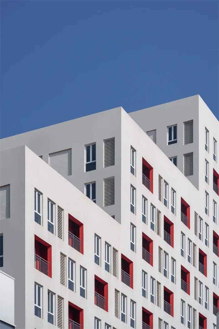 高低错落的立方体空间,打破了传统点式塔楼遮挡视线的形态,L型塔楼以阶梯状的形态向两侧的公园延展,围合状的阶梯塑造了高低起伏的梯田式建筑。