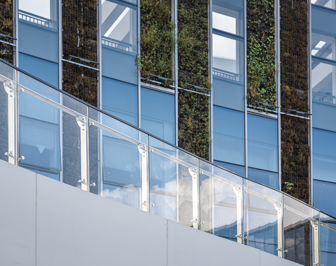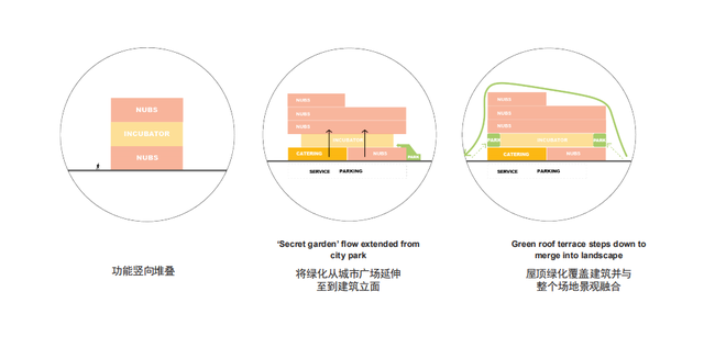 面向校园的立面则通过结合幕墙的垂直绿化,在景观上延续自然元素,在微环境调节上通过温差增强内部通风,并缓解热岛效应。屋顶绿化结合雨水收集系统设计,形成微型水循环周期,更进一步调节内部环境。