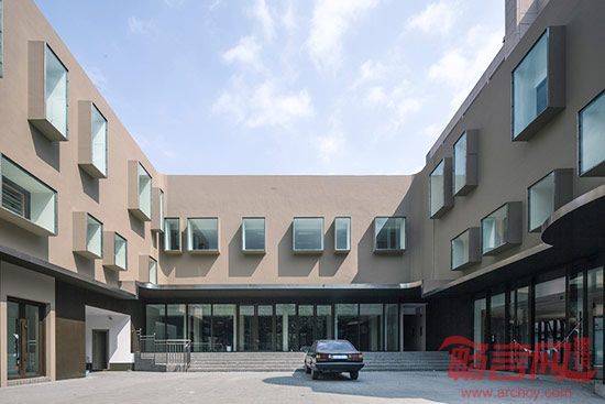 在原有建筑层高变化多、立面尺度语言无序的情况下,设计以外墙涂料和钢板、玻璃作为主要材料,由凸窗和凸窗套两种立面语言统一了建筑沿街面和非沿街面的形式。