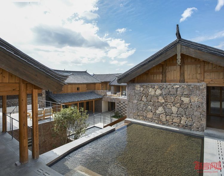 当下,有越来越多的休闲度假酒店是针对居住在城市的人们,在地方城市改建老民宅而建成的。这次的项目地块位于云南省白沙村,那一带农村到处可见并排而建的纳西族传统民宅,有浓郁的田园牧歌般的氛围。木造民宅外墙上堆砌的是产自当地的五花石,可近距离观赏雄伟的玉龙雪山。客户要求我们再利用四栋已有的纳西族民宅以及正门做设计,在延伸至周边的不规则地块上增建新建筑。