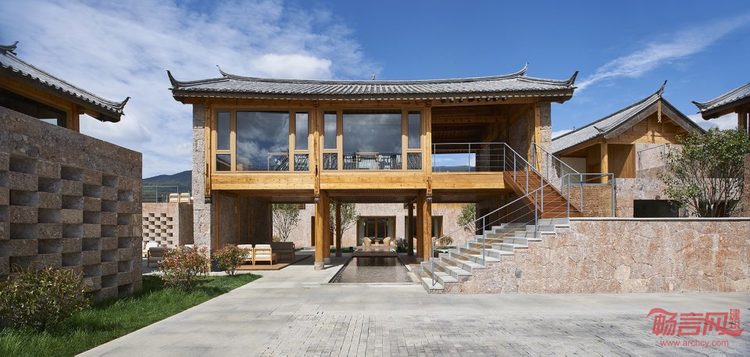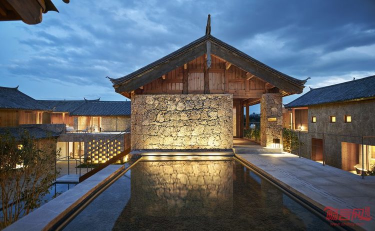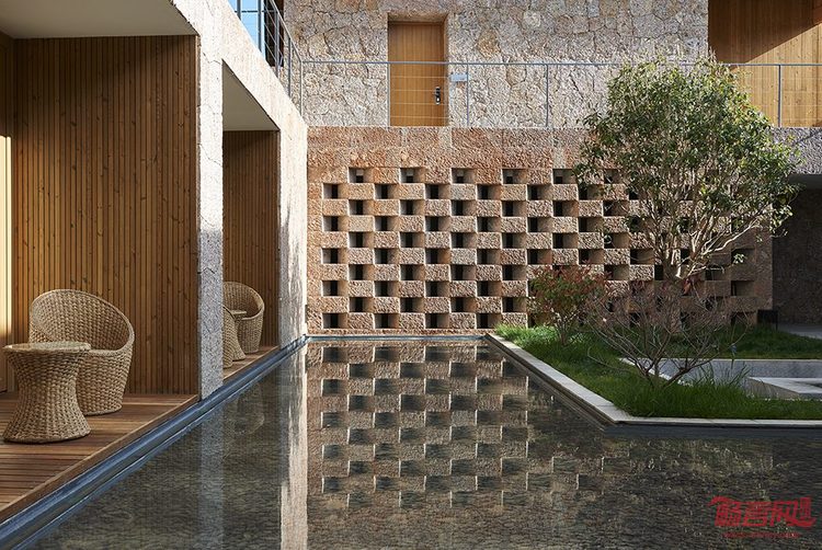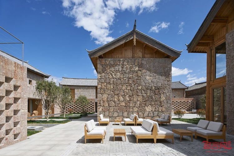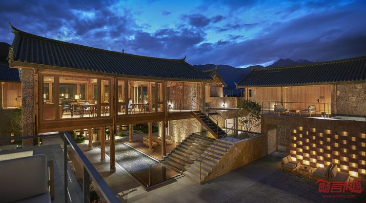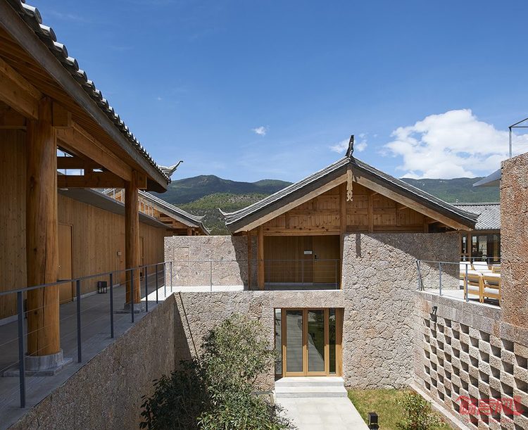 外墙部分的五花石的堆积方式也是经过深思熟虑,平面特意采用梯形,尽量避免在立面上出现大面积石层,营造出一种浮游感,同时也凸显石块本身的厚重存在感。客房以及走廊下方为吸引视线而设的光墙,则利用当地产东巴纸,设计成有渐变效果的格子光墙来有效控制光线。
