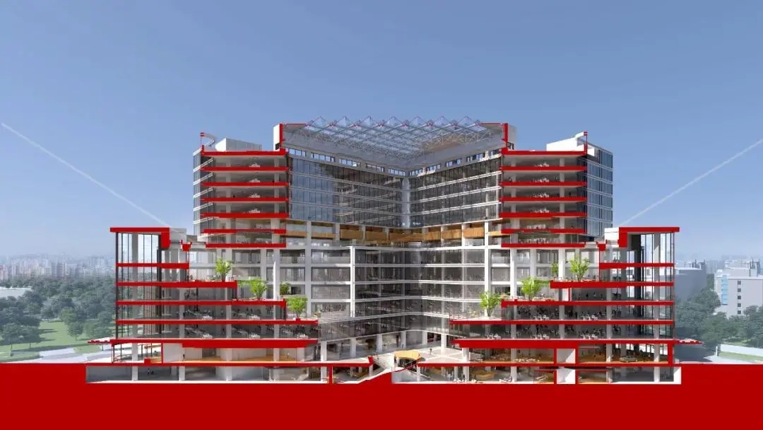 原建筑作为包括时装店、鞋店以及多个停车场在内的汽车友好型购物中心,已被停用。与北京南站相邻,让“京印国际中心”具备了引人瞩目的地理优势。因此,此次改造的重点是将这座52米高的建筑向城市空间开放。在之前完全封闭的建筑角落上,将施工建造一座拥有大尺寸透明玻璃外墙的5层高凸窗。透过凸窗,可以享受周围环境的全景视觉以及外部景观。借助屋顶的玻璃材质,形成明亮高大的中庭。围绕着充满活力的中心地点,形成改造后办公综合体中提升自由办公生态的景观露台有机组团。