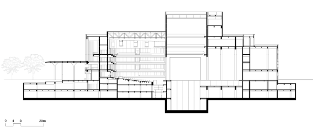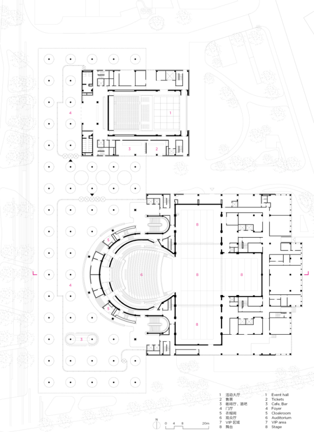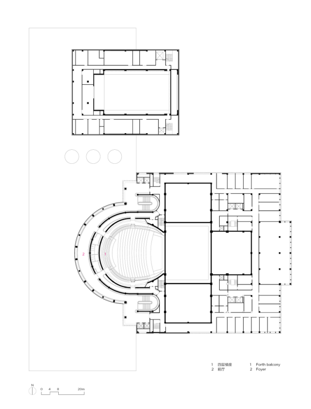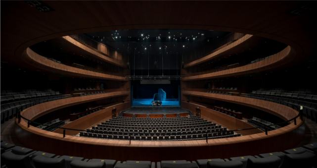 歌剧院的观众席全部由胡桃木木皮饰面,可容纳1,200个座位。内部空间为马蹄形,设有3层楼座。通过这种欧洲经典的布局,观众席反映了观众和表演者之间社区型的、充满意义的联系,他们共同体验艺术表演,这是与当今数字环境相反的简单而真实的现场活动。黑匣子剧院内衬乌木饰面,舞台灵活且可移动,因此可适应各种当代表演场景。此外,黑匣子剧院还可以向室外空间敞开——允许在校园内举行露天音乐会。