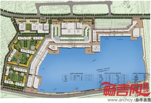本项目基地近似矩形,西侧住宅区由业主另行委托设计,北侧自西向东为超高层甲级写字楼、五星级酒店、购物中心、室外步行街及商务酒店,平面布局简洁明了,各部分功能分区明确,滞洪湖西、北两岸近似L型的步行街横贯万达广场,环抱滞洪湖。