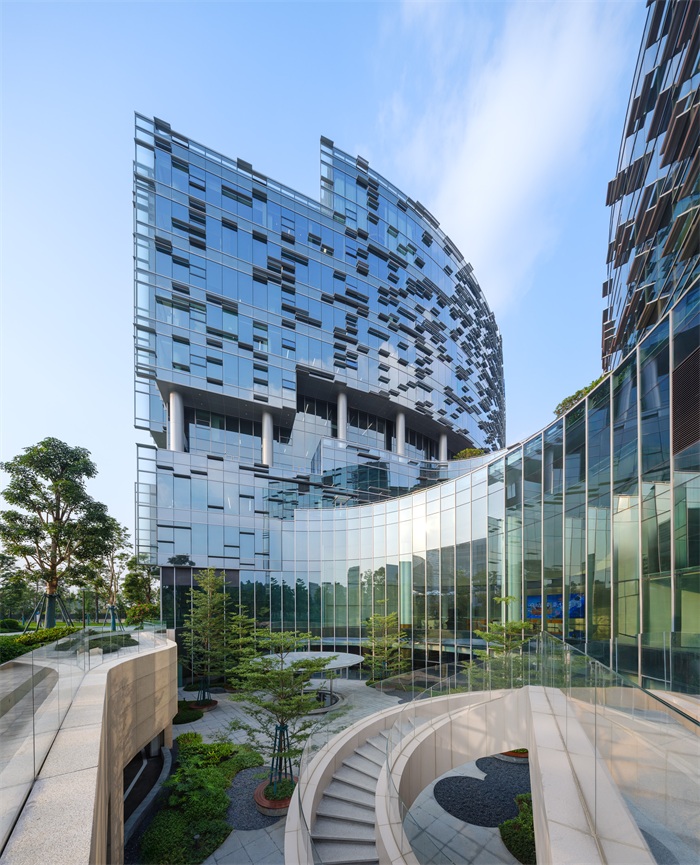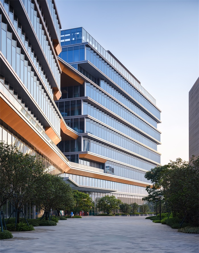 外立面设计也遵循同样的序列组织逻辑。采光需求较低的区域采用玻璃加肋板的材料组合,起到适当的遮阳和降噪作用;采光需求较高的区域则尽可能扩大玻璃幕墙的覆盖面积,有助于增加室内日照范围,同时充分利用朝向中心湖体的优势,力求实现景观视野最大化。