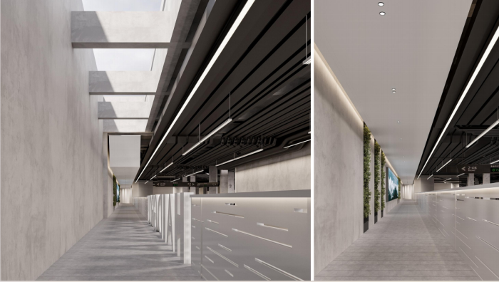 设计充分响应广州夏季炎热多雨的气候特征,地下空间被设计成了贯通的状态,在两个下沉广场之间为员工及访客创造了一条遮阳挡雨、四通八达的地下通道,并于通道顶部开设采光井,有利于引入日照与通风,优化地下通行与停车的体验。
