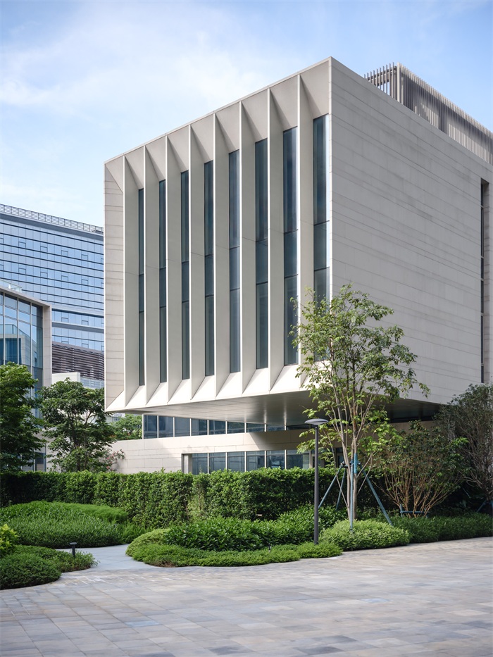 与海大文化展览空间毗邻的是小型办公建筑,采用相似的立面语言以及更具亲密度的立面材料,如暖色石材和纹理木板等,拉近与员工、访客之间的距离。