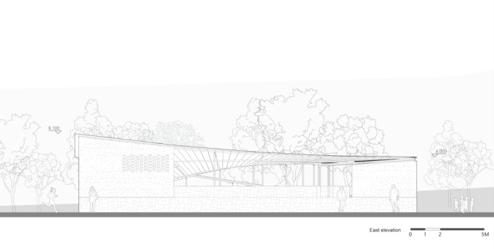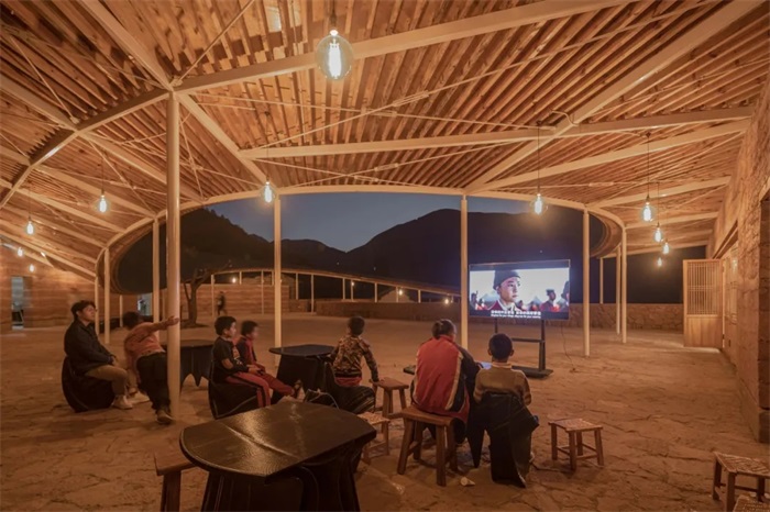 室外景观台地与地面采用当地村舍的干砌片石工艺,褐色的片石取材于下村河床中的砂岩。“石脚”和土坯墙体及坡屋面的搭配,演绎了最具在地性特征的立面建构关系。