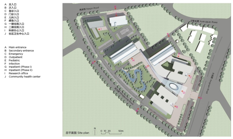 整个院区规划建筑面积约12.8万㎡,定位为三级教学医院,日均门诊量3,000—3,500人次。其中一期工程约8.3万㎡,包括医疗综合楼、社区卫生服务中心、污水处理站、液氧站等。南地块为新征用地,拟规划建设一期工程;北地块为医院原有用地,拟规划二期病房楼、科研办公楼、中心花园及一期需建设的社区卫生服务中心。
