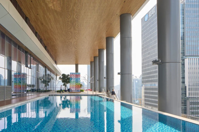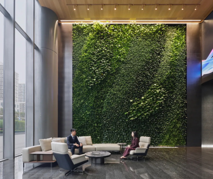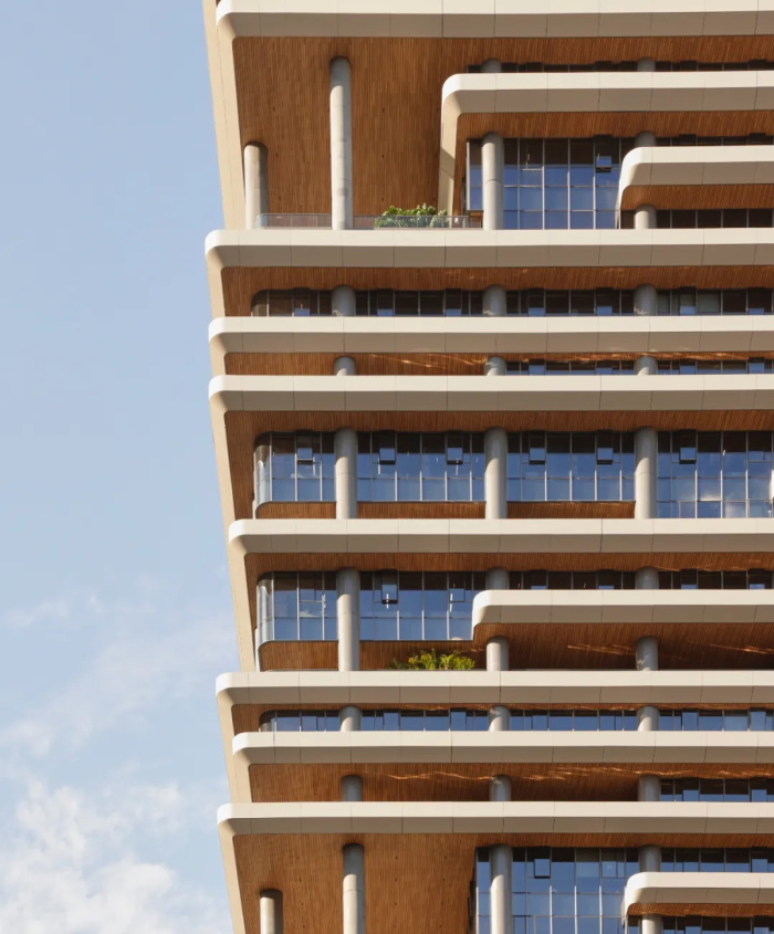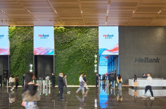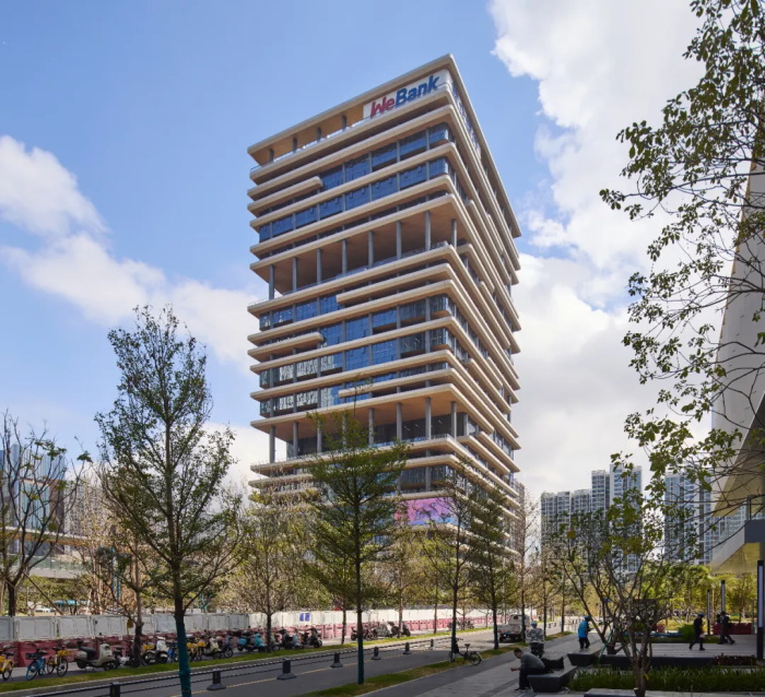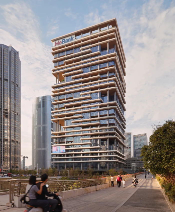 微众银行总部项目开创了办公空间设计新范式——将基于自然的设计策略与前沿科技相结合,打造健康、高效的办公环境。塔楼的造型极具表现力——交错的楼层和双层挑高设计——打造出“会呼吸”的多孔立面,促进空气流通和自然采光。内部空间采用宽敞通透的开放式办公布局,旨在营造舒适协作的氛围,员工可随时步入户外露台,亲近自然。超 4000 平方米的开阔楼层——为灵活的团队配置提供了可能,以适应金融科技、互联网企业快速迭代的业务需求。贯穿多层的室内中庭将不同部门串联起来。此外,一系列休闲和健康设施——包括篮球场、健身房、室外游泳池、员工餐厅和多功能厅——营造出工作与生活的平衡感和社区氛围。