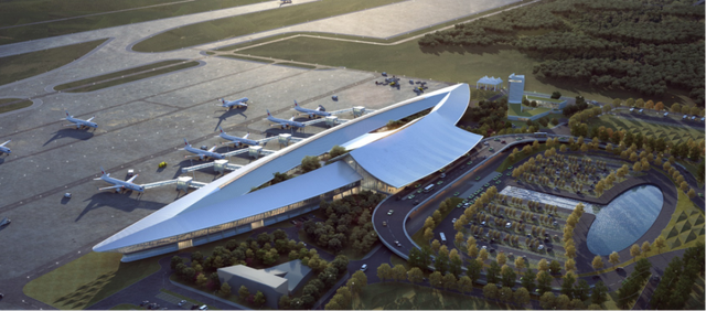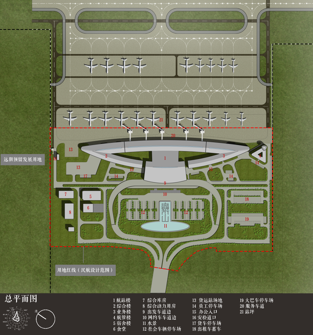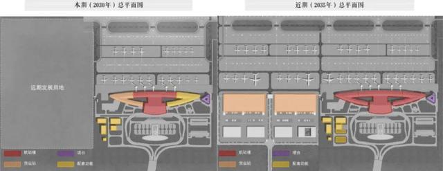 采用航站楼综合体设计模式,在约330亩用地范围内为近期(2035年)航站楼规模从2万㎡扩充至2.6万㎡进行预留设计,兼顾本期、近期航站楼整体形象完整、便于扩建、土地高效集约使用的需求。同时,预留了完整的发展用地,给后期发展腾出空间。