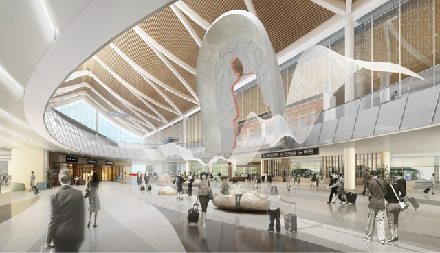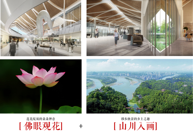 除常规的迎接集散,迎客厅外设游客中心,集候车休憩、旅游服务、信息发布、品牌展示、商业餐饮五大功能为一体,同时融合“金顶佛光、山峦云海、三江汇流”的意境,展现出一个艺术博物馆式、让旅客印象深刻的空间。