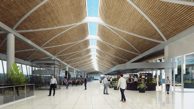 在局部暴露的连续交叉的梭形梁与天窗之下,指廊商业附属用房开放、通透,并在此基础上,增设咖啡吧,开放式休息区等提升旅客体验的空间节点。