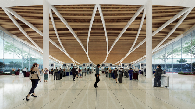 二层室内局部露明的结构犹如一朵朵莲花的花瓣,离港与到达大厅中庭的悬空佛像剪影雕塑则正对着屋顶结构,意为“佛眼观花”。