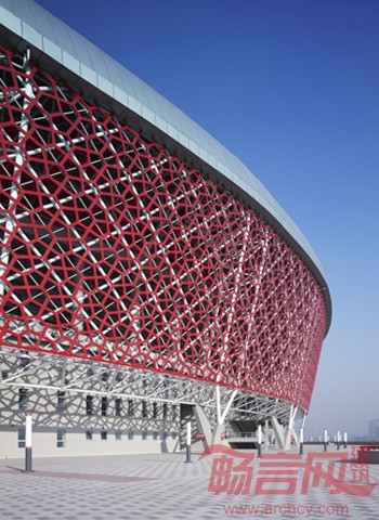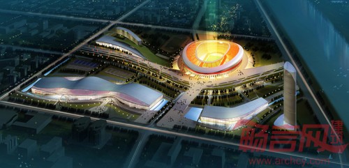 山西体育中心占地1238亩,总投资为16亿元,包括60000座的主体育场、8000座的主体育馆、3000座的游泳跳水馆、1500座的自行车馆和综合训练馆等。主体育场在东北方,朝向城市中心。体育场西侧为自行车馆、游泳跳水馆,东南侧为综合训练馆,分别以流畅的曲线为基本造型,列于体育场两侧。为与主题相呼应,体育场西北侧的运动员训练馆和公寓以及通往体育场二层的坡道也是曲线造型。在场地东南角预留了国际体育交流中心和商业用房的规划用地,使其与主场馆区既能联系又相对独立,有利于人流的迅速疏散。