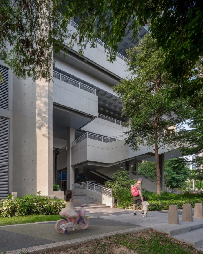 场地的东侧为建筑主体,整体以现代主义建筑的基本框架呈现了一座符合岭南气候的公共建筑。建筑空间设计以水平“多重地面”为基本概念,强调以城市及公园地面向建筑内部公共空间的延伸,使其在附近林立的高层建筑中成为难得以完全开放姿态呈现的建筑体。该策略一方面消解了室内外空间的限定,营造出多层次立体活动空间;另一方面为场地中提供阴凉、穿堂风,回应了南方气候特点,实现全天候的低碳低维护体系。