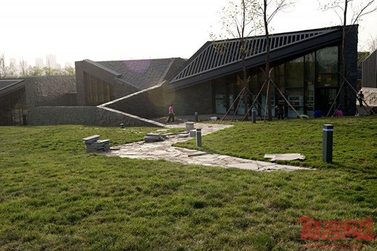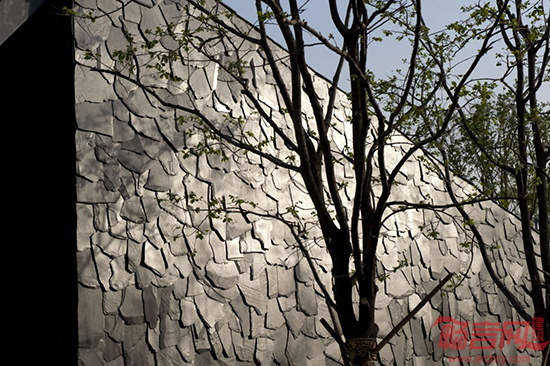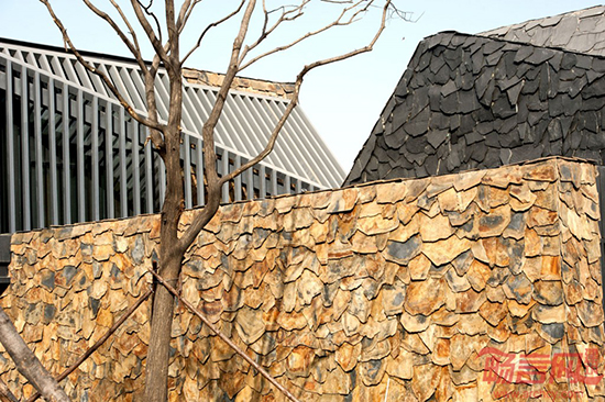 服务区采用产自陕西南部的片岩作为主要外饰材料。这种材料多用于铺地,设计师选用深灰、墨绿和铁锈红三种片岩,将这种材料创造性地用于建筑的屋顶及外墙,形成一个会呼吸的建筑肌肤。多种色彩片岩的应用,也使灞上风情服务区在整体上呈现出一种多层次的自然属性,使建筑与园林更加和谐,使服务区具有一种朴素的时尚。