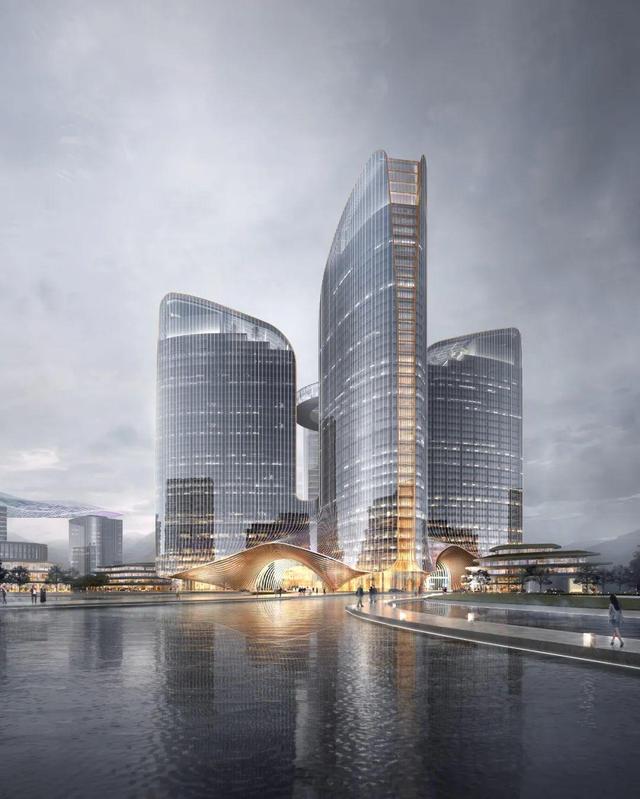 一方面,设计在南部商办地块放置一座醒目而富有韵律感的地标建筑,四栋塔楼融为一体的形态产生“蝶”的联想,与科创云廊遥相呼应。