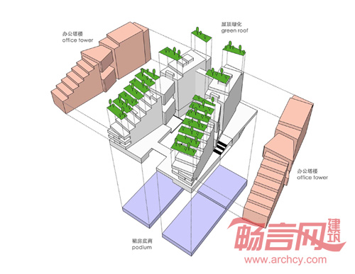 简介:通过对基地的情况(面对后海湾)和深圳当地气候(风向、温度、日照、台风)的分析,推敲出这样一个体块。建筑成一个“八”字形,让办公的每个面都能看到海(面对海湾的地形)。通过计算风向让海风能轻松穿过建筑内部,同时开洞的处理又能避免台风对对大面积墙面造成损害(风向)。办公空间在一天最炎热时候基本都在自身阴影内,西晒的部分只有交通空间(日照)。同时设置屋顶退台绿化,雨水收集系统。完全是一个面朝大海,春暖花开的景象。