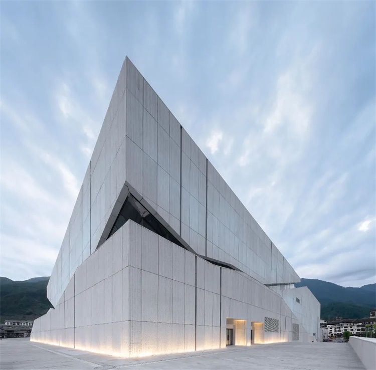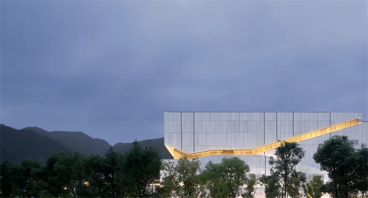 巴山大峡谷“梦回巴国”剧场结合当地山形,在建筑立面设计上追求坚毅、硬朗、雕塑感强的肌理效果,利用金属、GRC幕墙的结构,追求干净利落的构造(干挂做法、开缝或密封缝处理、内层防水构造等)。金属、GRC幕墙系统工程妥善解决了与各相关工程交界面、收边及收口部位的衔接处理问题,保证了建筑功能、效果的整体统一。建筑外立面与当地环境融为一体,并且独具新剧场、新风貌的特色。室外楼梯更是与巴蜀地区独特的山崖栈道相呼应,展现“蜀道难,难于上青天”的意境。该建筑突破了剧场原型,用“山石上开凿栈道”这句简单的话语牵引出动线引导、高点入场、消防疏散、屋面开放、夜景亮化、历史文化、“巴”字意象、剧目情境等内容。