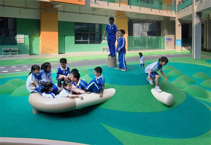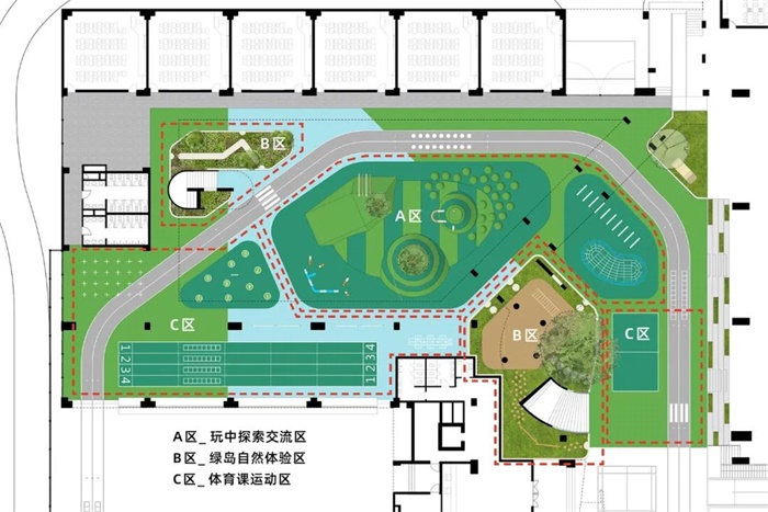 由于该方案超出了原设想的改造规模,决定分两期施工,北半部的一期改造区于2023年暑假完工。一期面积2,025平方米,设计了三个主题活动空间,分别是A区的玩中探索交流区、B区的绿岛自然体验区、C区的体育课运动区。