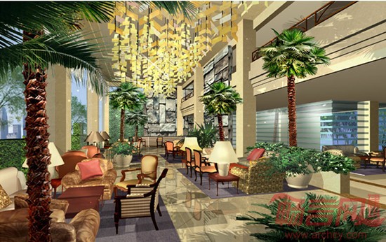为增添绿色景致,在大堂吧做6~8棵热带树。树的标本是经过防虫和防腐处理的真树皮,经过再加工后做成与真树非常近似的假树,高矮不等,在夜晚树冠会发亮,起到灯的作用。在大堂东侧墙壁上做一些粗旷自然的石头,象征河南中原文化的古老,石与树、沧桑与鲜绿的对比,形成了室内简洁鲜明的环境设计理念。