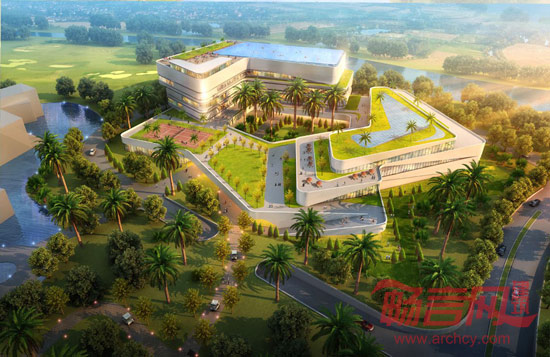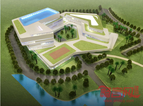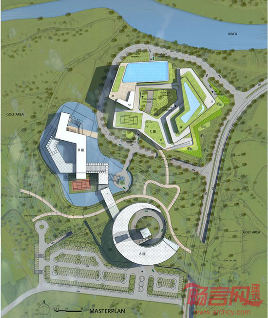 建筑的体量经过精心设计,创造了一个和谐且流畅的总平面规划,同时也提供了好的朝向和非常好的视野。建筑流线型的形式,适应了其周围环境,并使开阔的视线更加流畅。新会所遵循对西方以前的传统会所的理解与延续来进行设计,并给与其现代的建筑形式。建筑物的内部组织基于一个开放的内中庭空间,在其周围形成人流环线。两栋L形建筑围合的开放式的内中庭连接了公共空间,也同时把高尔夫球俱乐部和康体中心联接成为一个整体。
