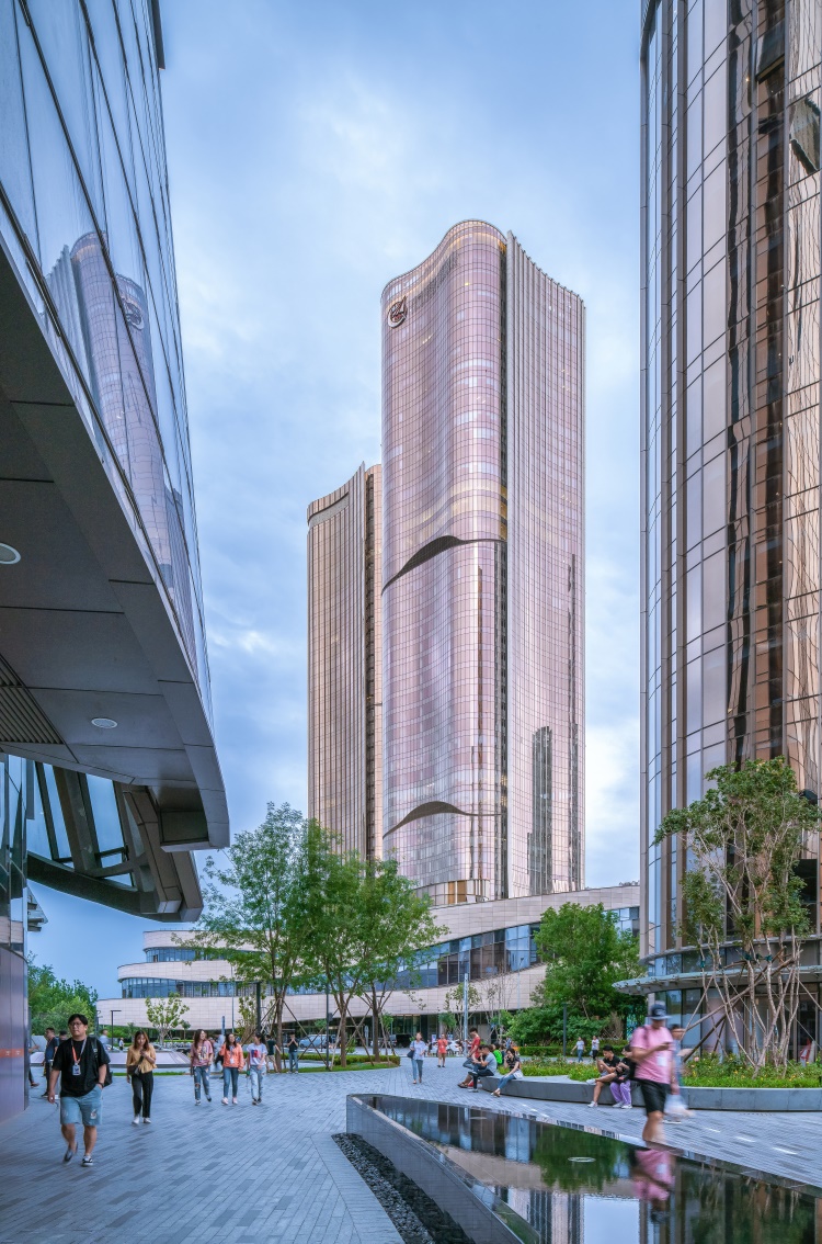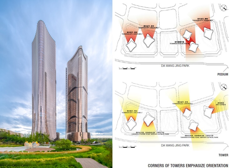 项目包含三个地块、四位业主、五种业态,挑战难度不小。设计将建筑按照2-1-3的数量依次从东至西排布,东侧为两座高层办公楼,中间地块为包含顶部城市公共绿色空间的商业会展大楼,西侧地块为两座高层办公塔楼和一座高层公寓。