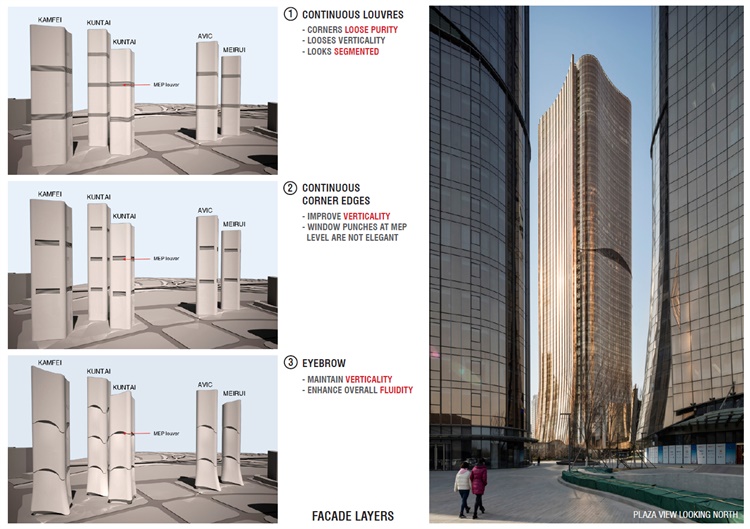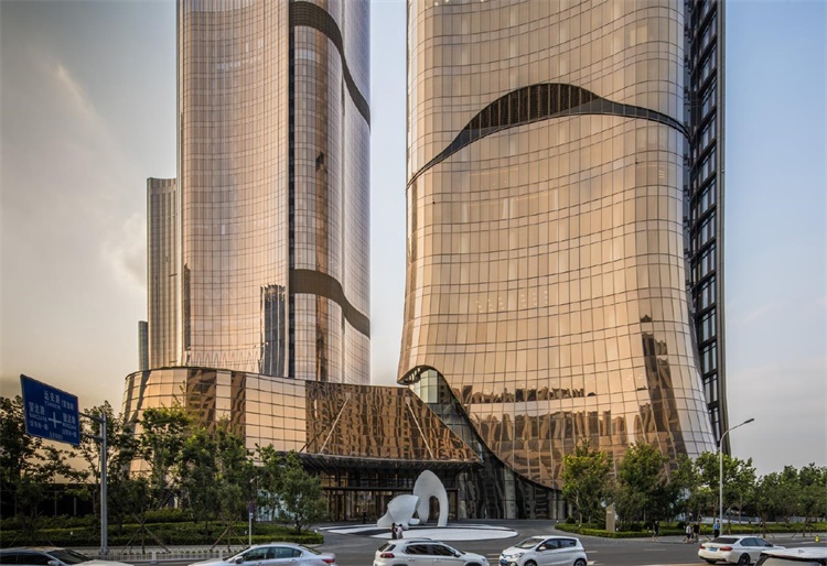 考虑到整体视觉效果,设计给楼层较少的塔楼增加了两边连续立面,以垂直的线条描绘树柏,增加了塔楼的修长感,塔楼与裙楼用模拟树干与树根的形态,模拟树根的曲线,为硬挺的立面增添了一份柔美。