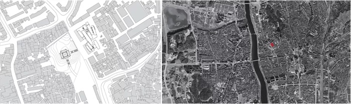 康熙五十一年(1712年),法国传教士昂特雷科莱(中文名殷弘绪)在一封发往欧洲的长信中,对景德镇的城市风貌做了生动的描写。景德镇老城位于碧水涟漪的昌江两岸,江水穿越而过,南河环绕于东南,西河贯穿于西岸,形成了三水环城之势。老城之内,小巷子与昌江垂直以便瓷器的运输,大街市平行昌江布置,两侧布满了商铺。景德镇御窑厂位于该市珠山中路北侧,包括龙珠阁周边地区和市政府原办公大院及宿舍区、居民民宅等区域。御窑厂是元、明、清时期专为宫廷生产御用瓷器的所在地,是中国历史上烧造时间最长、规模最大、工艺最为精湛的官办瓷厂,因此地下文物遗址丰富。随着人们在遗址上的频繁活动及不断开发,御窑设施和地面建筑早已荡然无存。御窑博物馆就位于与御窑遗址东侧相邻的相对受限制的历史区域中。御窑博物馆的地域性实践首先融入了对场地的阅读。作为重要的城市文化建筑,博物馆顺着昌江走势平行布置于政府给定的场地之内。