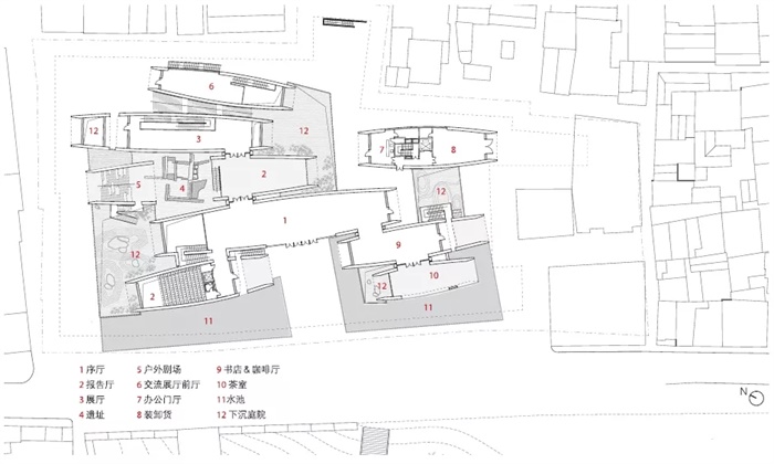 场地中耸立着一根高耸的烟囱,烟囱的存在提醒着御窑厂遗址曾经的规模与辉煌。建造地段西临御窑遗址,南侧、东侧被历史的老房子所环绕。基地边界呈现出锯齿状(里出外进的关系)就是在应对周边受到保护的民居。虽然北侧的高层住宅在体量上对博物馆形成了一定的压迫感,但是,当视线穿过砖拱远远望见住宅之上晒晾的衣物,耳朵听到楼上传来熟悉的唤喊声音,这种现象给庄重且神秘的博物馆带来与日常有关的生活气息。实际上,环境的多元性在一种非等级式的体验过程中将人们对项目的注意力适当地分散了。