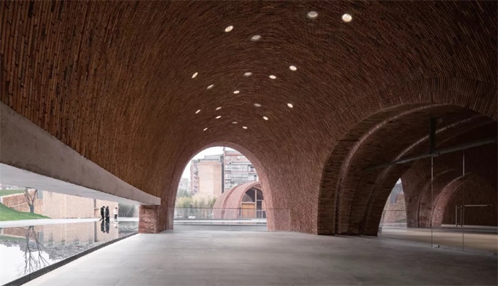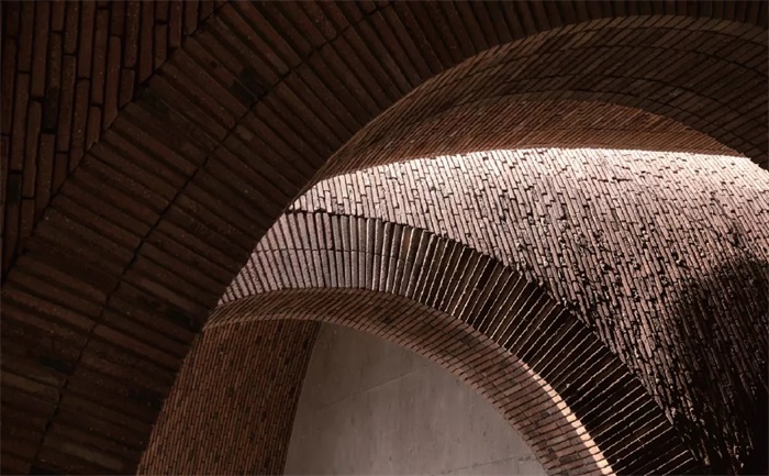 在建筑的材料和结构方面,受到徐家窑的启发,御窑博物馆采取的拱的形态并不是笔直的筒拱,而是两端有收拢,略显纺锤形的一种优雅美观形态,同时体现了建筑师朱锫的造物驾驭和支配能力。对于建筑的结构而言,每个建筑拱体的结构近似三明治,内外两层砖中间为钢筋混凝土,夹在中间的混凝土拱为主体结构,以抵御地震时的侧推力,外部采用新老窑砖混合砌筑。在现代主义的语境下,这种三明治结构似乎违背了“砖想成为拱”的金科玉律,笔者以为这种看法是把材料与结构的认知教条化了。