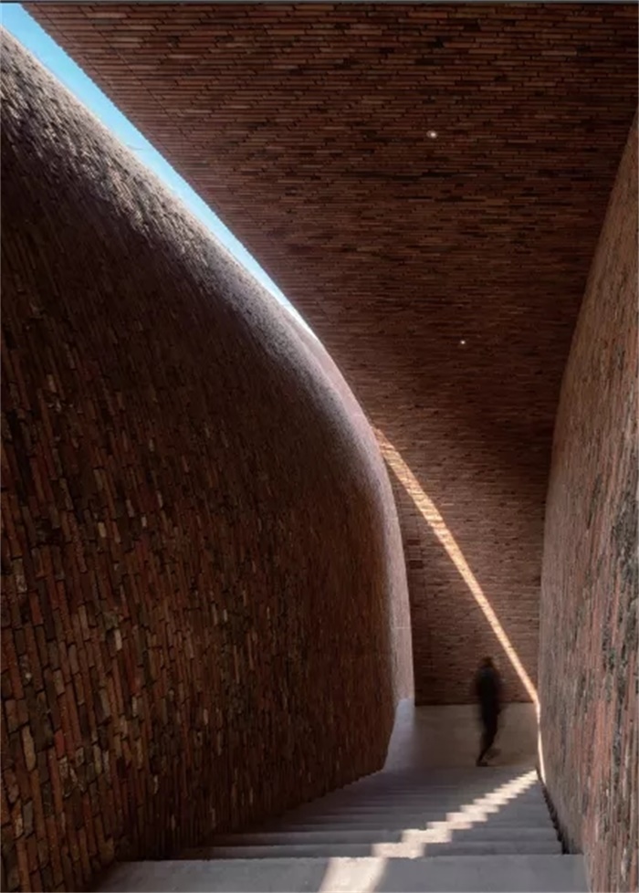 在御窑博物馆的主要空间,朱锫通过展厅局部上空、木制门窗间隔、内外楼梯上下等设计手段,实现了可通视可对望、有转折有铺陈、拱中有洞、拱洞相连的空间效果。作为交通枢纽的楼梯,其与楼层的结合延展了空间的丰富性。御窑博物馆中的楼梯,有宏阔有逼仄,有长远有近耸,拱上下以及拱之间由可以攀爬的梯彼此连缀,便于通达与观望。在御窑博物馆西侧拱体,一条通向报告厅前拱的狭窄长梯隐蔽于建筑主入口下方;而在东侧拱体,一条沟通交流展厅与地面的单一路径隐藏在建筑身后。最为显眼的是,在御窑博物馆北侧两拱之间,一条较为宽阔的坡梯贯通上下。这里,建筑师让人从地面向下沉庭院形成一个俯瞰式的回望,唤起了游人置身“真山”的类比联想。