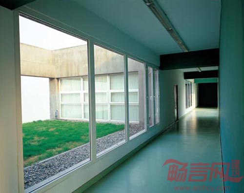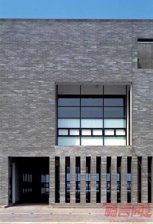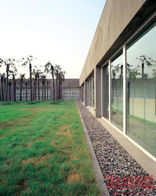 基地建在重庆长江南岸高新科技开发区内,除了实验室外,它包括了研究、办公、展览、生活等设施与空间,基地则是临长江并平行于江面的不大的一块带状地带,基地的紧凑和功能的复杂促成了一栋单一的线性建筑,这个线性又是由若干相对独立的部分组成。这暗示其复合的使用:实验室、研究、办公、生活等,及各种行为之间的关联。立面上两道平行的混凝土砌块墙以及墙上孔洞及缝隙的变化正体现了这种整体与局部的辨证关系。建筑内部每个不同的使用分区又具有不同的空间组织。