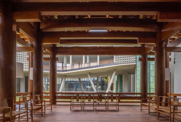 建筑师在版本馆使用了3种不同的木构,北阁采用的是比宋代更早的叠木结构。这些“活着的”、会生长的的材料,如木结构、夯土墙、屏扇、铜瓦屋顶,用在建筑上,由此形成一个仿佛会呼吸的房子。