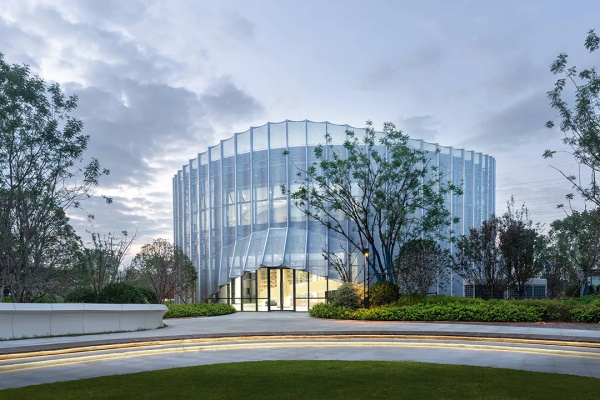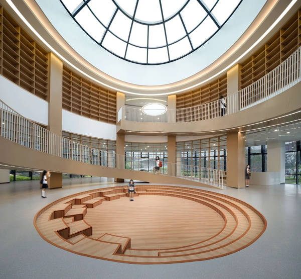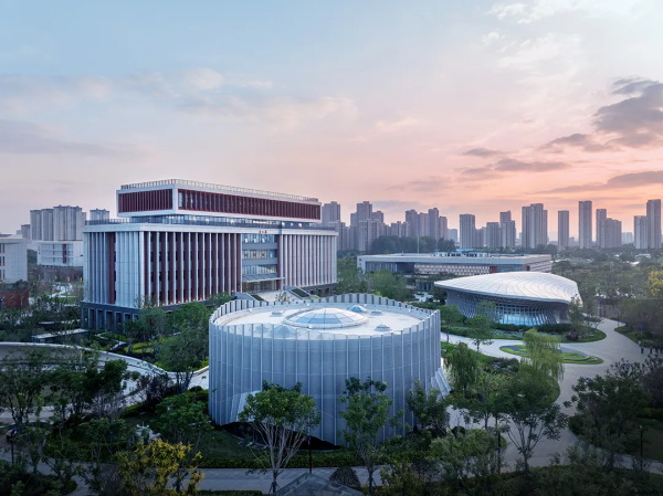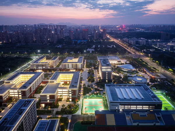 新校区主体规划架构以“秩序和艺术”为设计理念,南片区的教学组团和生活组团以秩序和理性为理念展开空间布局,教学楼以南入口为轴线东西对称布局,宿舍楼延续理性的布局原则错落设置于教学楼东侧。北片区的公共教学区采用艺术和感性的规划原则,礼堂、体育馆和综合楼三组建筑作为校园内的标志性建筑,坐落于校园中部,成为校园核心区域,形成强烈的向心性,整体展现出动态的空间关联。