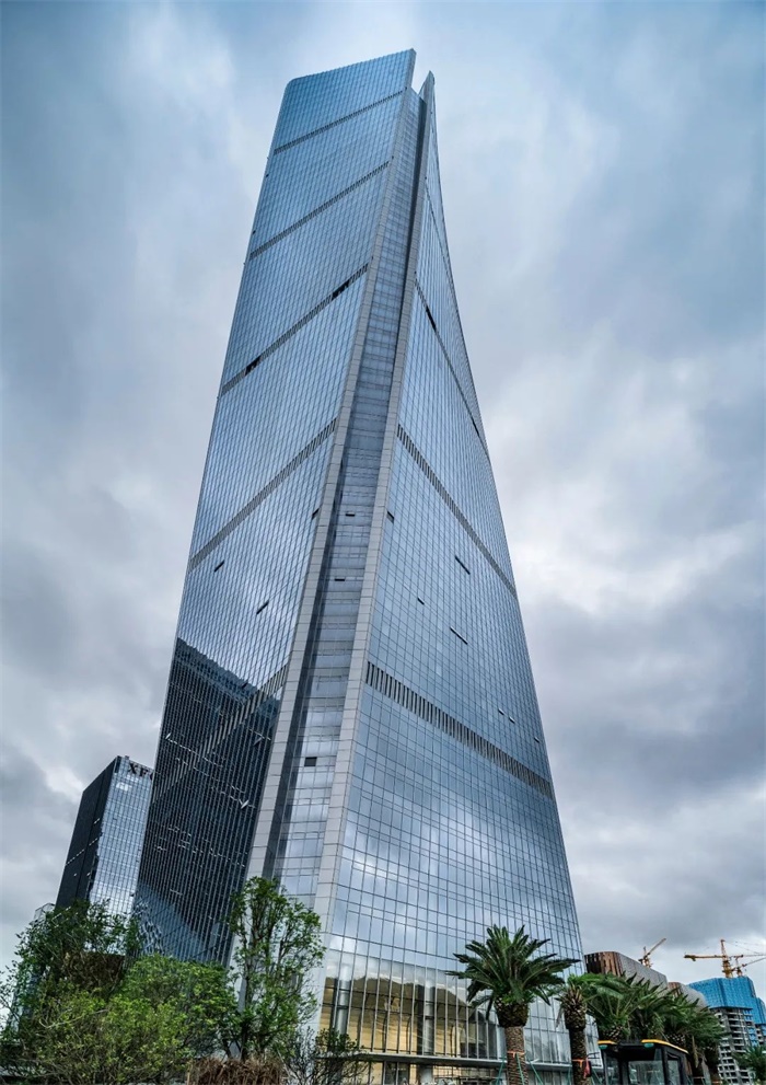 近 300 米高的前海世茂大厦,是深圳前海地区的地标,也是世界上最高的结构扭转建筑之一,它采用自下而上的收分式设计,实现外幕墙+结构外框柱同时扭转的形态。