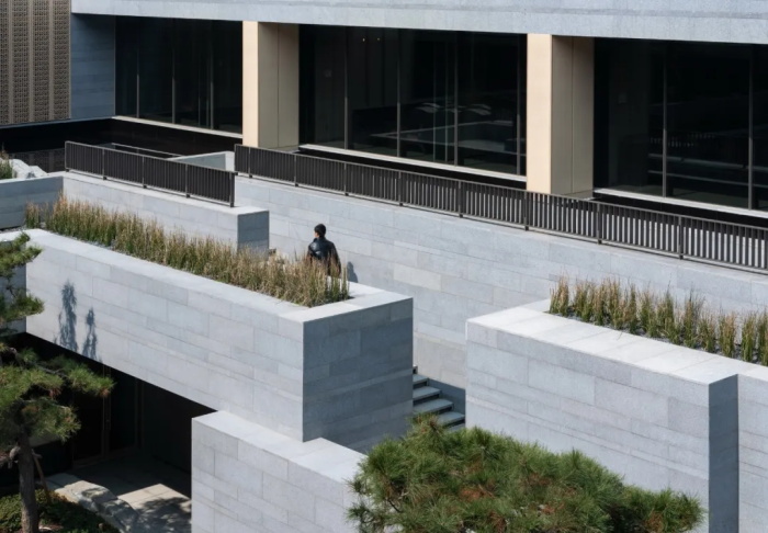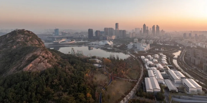 建筑单体在保持统一尺度的呈现出各异的形态,体量间的错动提供了围合造园的契机。多重庭院如同狮山余脉的延续,绿色植被渗透进建筑的间隙,直抵水岸,联通嵌套,处处成景。建筑师尝试模山范水,探寻平面造园手法的现代性表达:以近在迟尺的狮子山为凭引,构筑出跌宕起伏如山势的立体庭院。平地升而为台,降则成谷,一系列 “台园”与“谷园”彼此串联,形成了独一无二的景观体验。